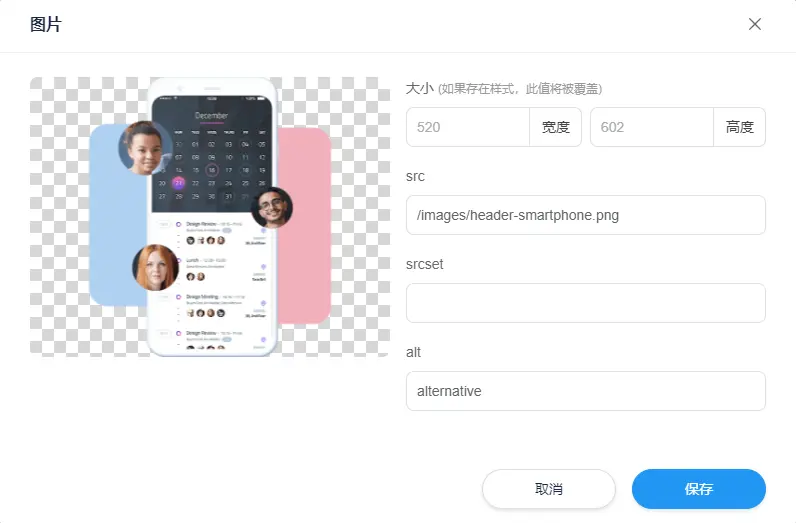 图片: 如果该元素是一张图片, 可以点击更换图片